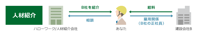 人材紹介会社は「相談して、求人を紹介してもらう」という形態から、よく派遣と混同されがちですが、人材紹介会社が担うのは、あくまで「入社するまで」の転職活動のスムーズ化。採用後は知人紹介や求人サイトで転職した場合と同様、入社した会社の社員として雇用されることになります。