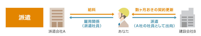 派遣会社の社員として、B社に出向となるため、給与・待遇・福利厚生は派遣会社A社に準ずる。何ヶ月かごとに契約更新がある。