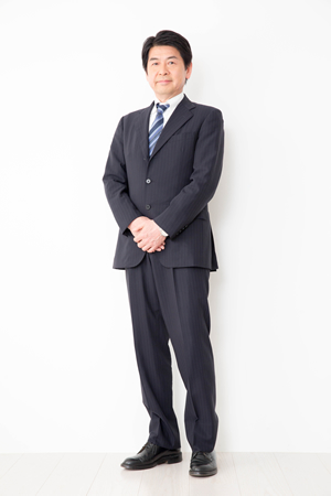 スーツに白いシャツ、ネクタイ、黒または茶色の革靴が基本です。スーツは大きすぎるもの、きつすぎるものを避け、ジャストサイズを。