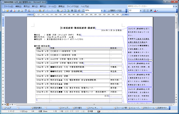 ファイルを開くと職務経歴書の記入例が表示されます。