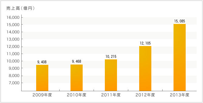 ※決算期が連結決算期と異なる一部の連結子会社については連結決算日に仮決算を行うことで売上高を連結しており2012年度以前の正式な内訳が公表されておらず、また、2009~2011年度は項目が異なるため、2009~2012年度は合計のみ記載。
