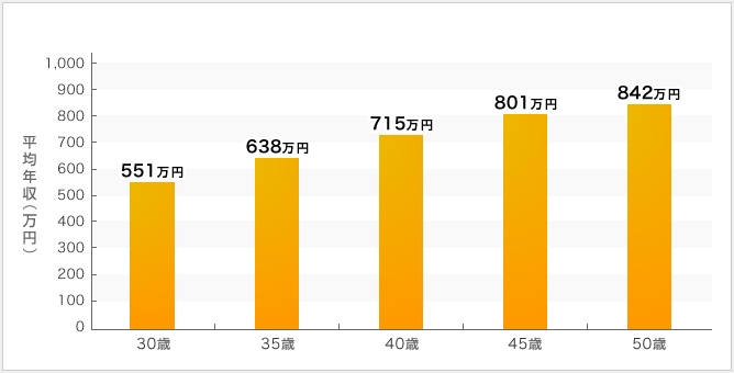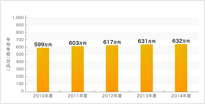 タカラレーベンの平均年収は2010年度から5年連続で上昇しています。直近の2014年度の平均年収を2010年度と比較すると、約33万円上昇しています。