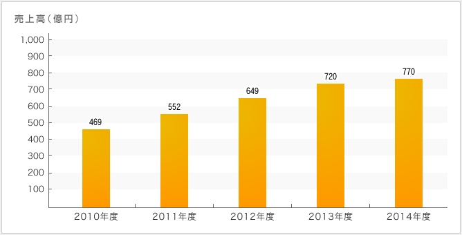2014年度の売上高は770億円で、前年度比6.9%増となりました。経常利益は85億円で前年度比7.0%減、当期純利益は57億円で前年度比2.0%減となりました。