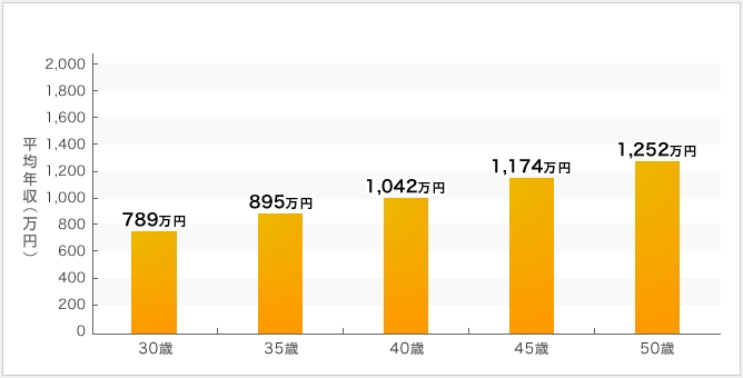株式会社ミツウロコの世代別平均年収は、いずれの世代においても全上場企業の平均を大きく上回っています。年齢が上がるにつれてその差は大きくなり、50歳の段階では約570万円以上も上回っています。