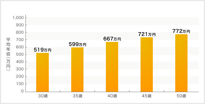 北野建設における年代ごとの平均年収は、どの年代も全上場企業の平均年収を上回っており、45歳以上になるとその差はさらに大きくなっていきます。