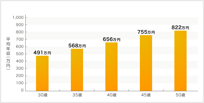川崎重工業の年代別平均年収を全上場企業の平均と比較すると、30歳と35歳では若干平均を下回っていますが、40歳では平均と同水準、45歳で上回り、50歳の段階ではその差が約160万円まで広がっています。