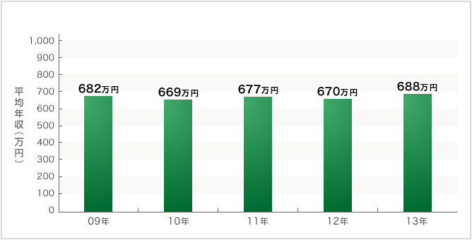 東急建設の年度別平均年収を準大手ゼネコン10社の平均と比較すると、2010年度まではやや高い額で推移し、2011年度にその差は約50万円に広がりましたが、2012年度では平均を下回り、2013年度でほぼ平均まで回復しました。