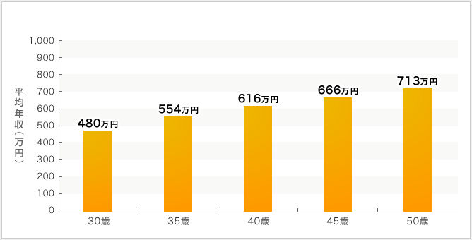 若築建設の平均年収を年代ごとに全上場企業の平均と比較すると、30歳、35歳、40歳、45歳では下回っていますが、年齢が上がるにつれてその差は小さくなり、50歳の段階では平均を約50万円上回っています。