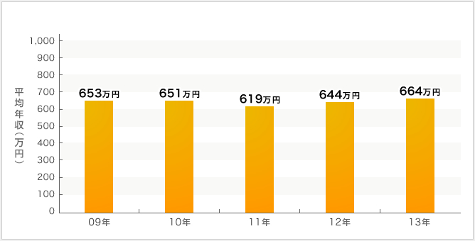 飛島建設の年度別平均年収を中堅ゼネコン9社の平均と比較すると、いずれの年度においても高めであると言えます。2011年度までは平均との差が10~20万円程度でしたが、2012年度には約40万円の差に広がり、2013年度でも約31万円上回っています。