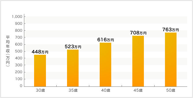 鹿島道路の平均年収を全上場企業の平均と比較すると、30歳、35歳、40歳では平均を下回っていますが、45歳の段階では約30万円上回り、50歳にはその差が約100万円に広がっています。